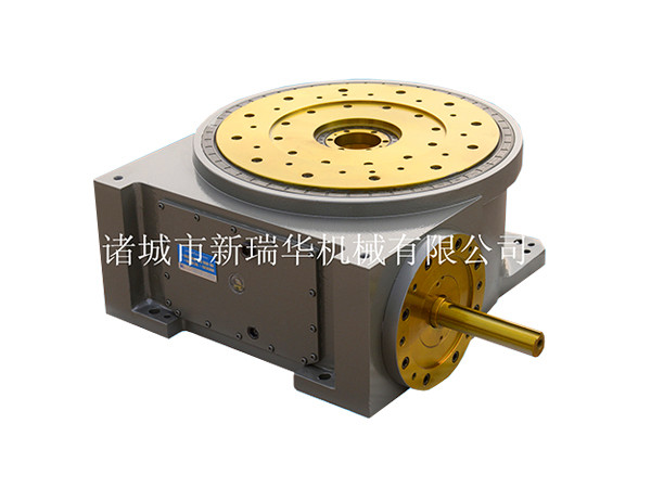 將勻速輸入運動轉(zhuǎn)換為間歇輸出運動,或均勻地減速的間歇輸出運動。輸入軸帶動凸輪,在凸輪動程角區(qū)域,分度轉(zhuǎn)臺工作臺面旋轉(zhuǎn),當旋轉(zhuǎn)至凸輪直線段區(qū)域,工作臺面靜止。滾子軸與凸輪高精度的配合提供一個鎖緊的工作位置。我們盡可能地增大旋轉(zhuǎn)凸輪的設計尺寸和使用尺寸, 使分度轉(zhuǎn)臺運行更平穩(wěn)。機殼內(nèi)有側(cè)通孔,便于電纜或管體走線。通過使用分度轉(zhuǎn)臺的控制系統(tǒng)減少剎車磨損, 使得旋轉(zhuǎn)分度臺終身免維護。